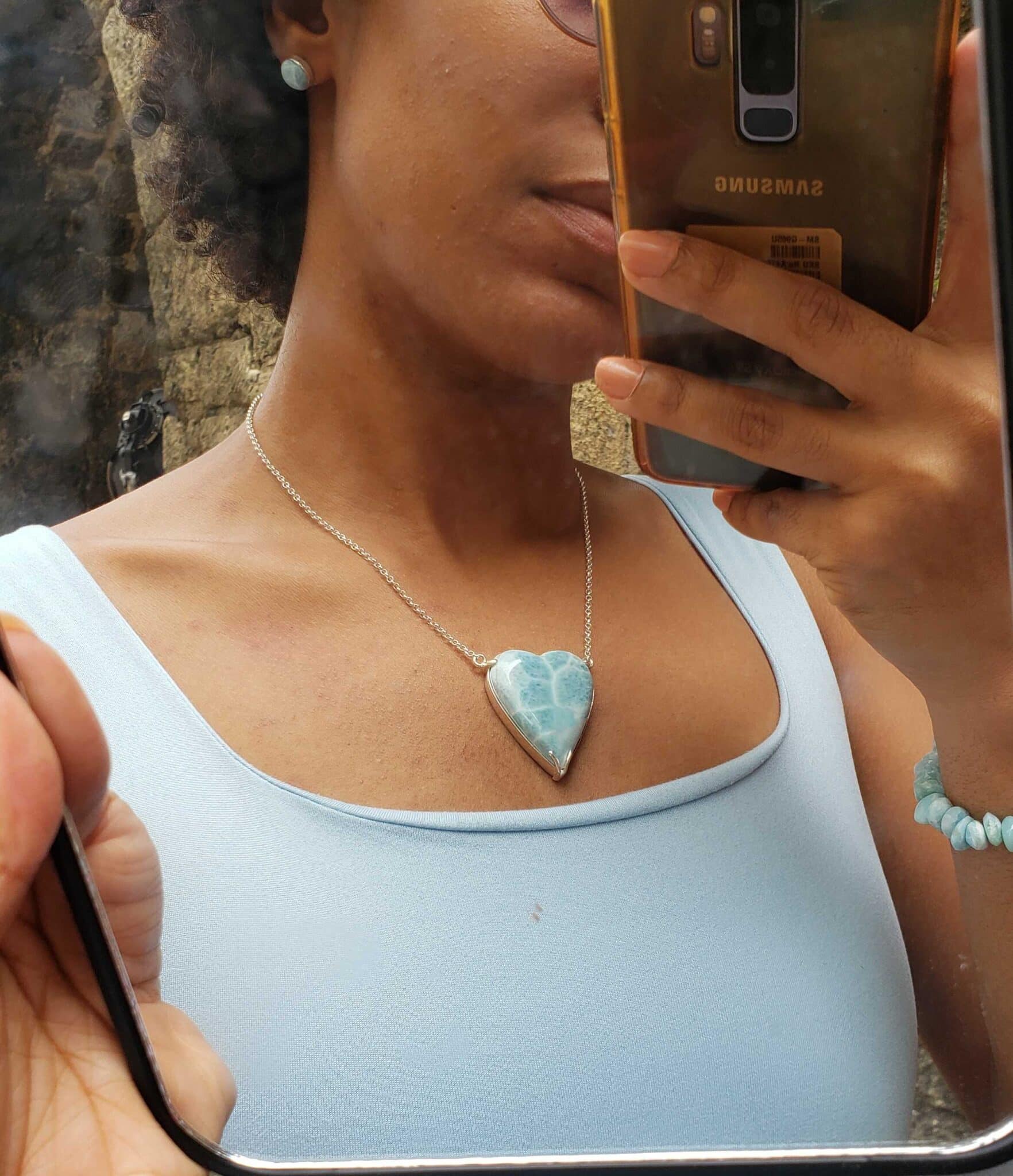 Larimar heart shape pendant perfect for all occasion, methal is silversterling 925, long chain 8 inches with a special silver weave.